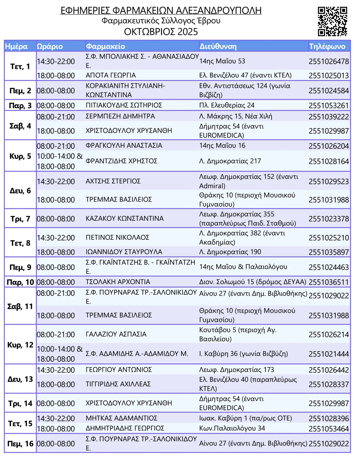 ΕΦΗΜΕΡΕΥΟΝΤΑ ΦΑΡΜΑΚΕΙΑ ΑΛΕΞΑΝΔΡΟΥΠΟΛΗ